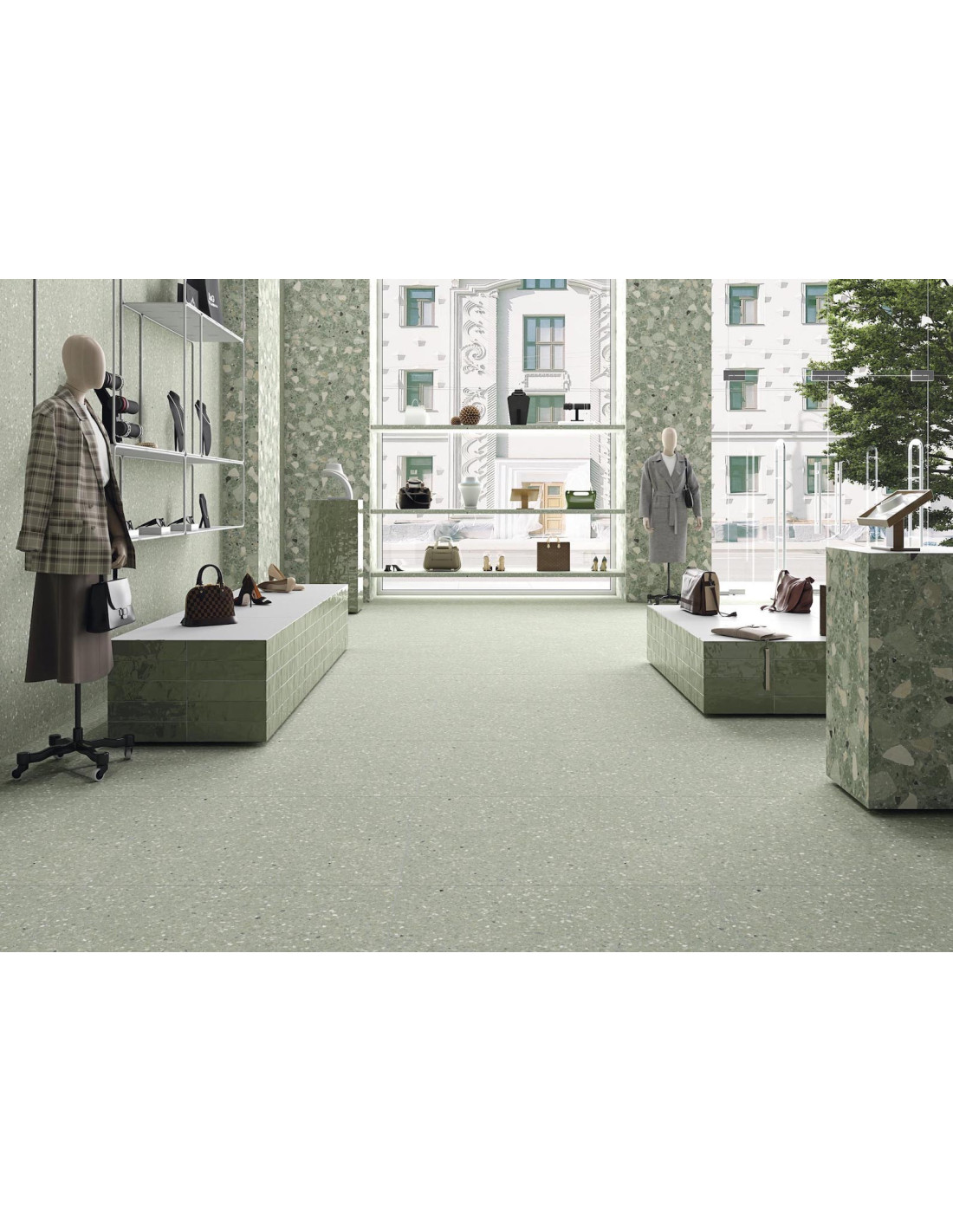 Gresie Terrazzo Monte Carlo cu finisaj mat sau lucios, dimensiuni 80x80 cm. Culori: Grey, Beige, Black, Green, Red.