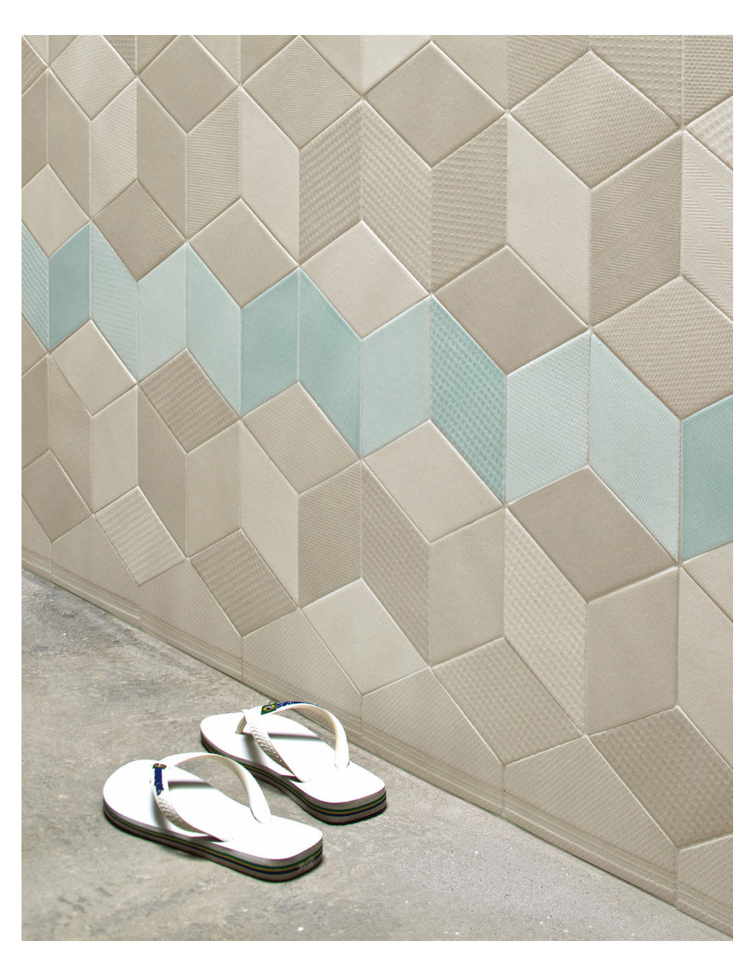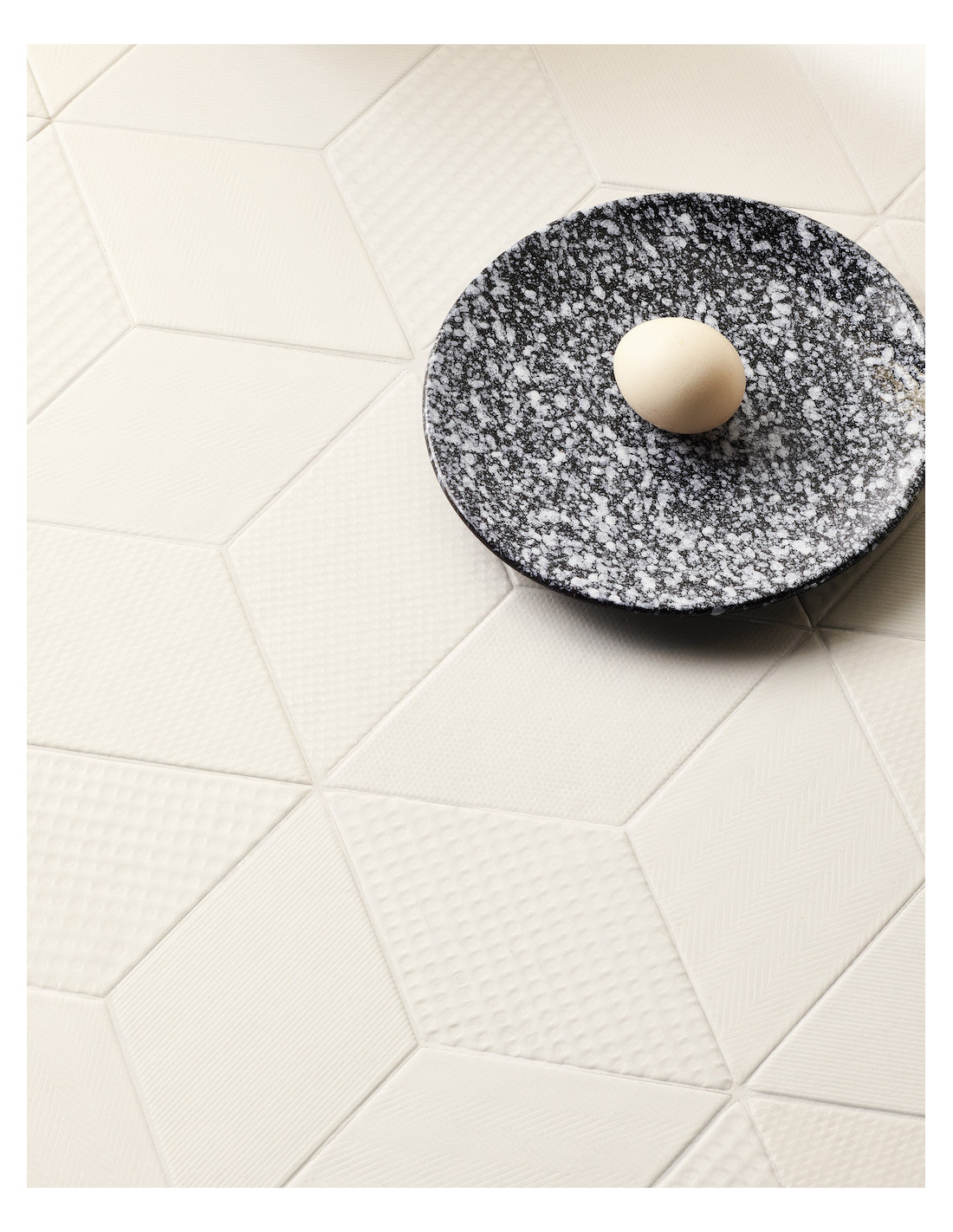 Gresie Faianta Mutina Tex by Raw Edges Culori Cream, Brown, White, Grey, Black, Blue, Olive, Yellow. 5 texturi, 3 tonuri pentru fiecare culoare. Dimensiuni romb 11.5x20 cm #gresierombica #faiantarombica #Mutina#Tex