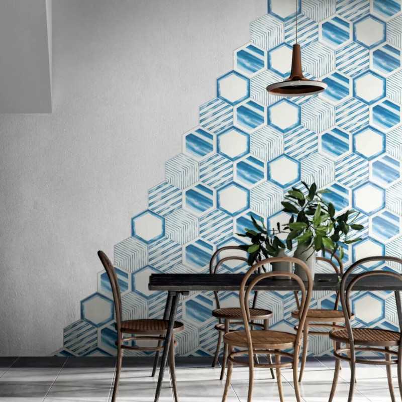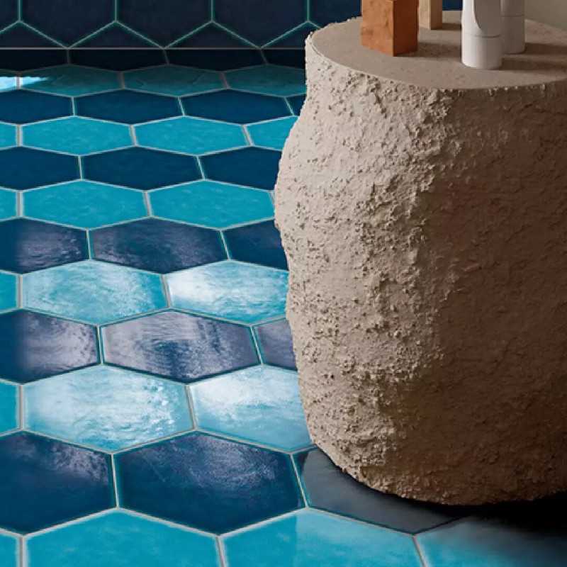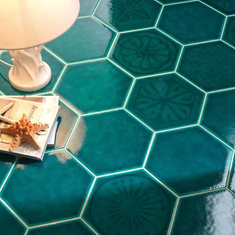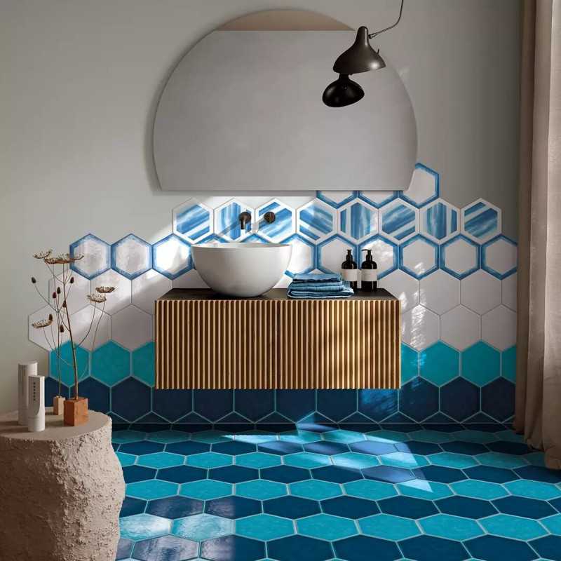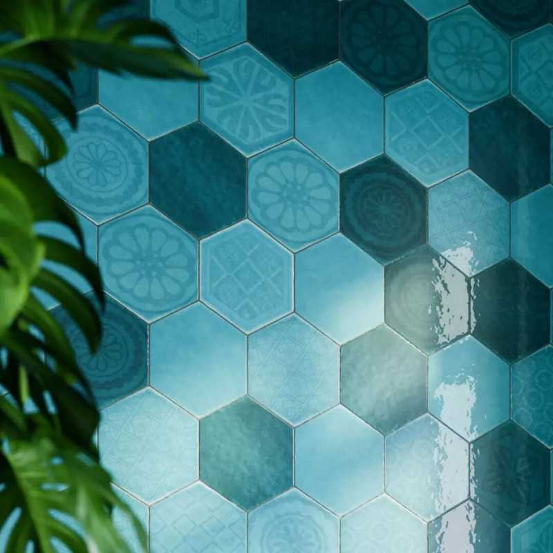 Faianta Gresie Sardinia. Gresie faianta hexagonala patchwork. Culori azzurro mare, turchese, giada, acqua si bianco. Mozaic faianta hexagonala si mozaic goccia. Faianta #patchwork pentru baie, bucatarie. #gresiehexagonala #faiantahexagonala #gresieturcoaz #faiantaturcoaz #sardinia #cerasarda