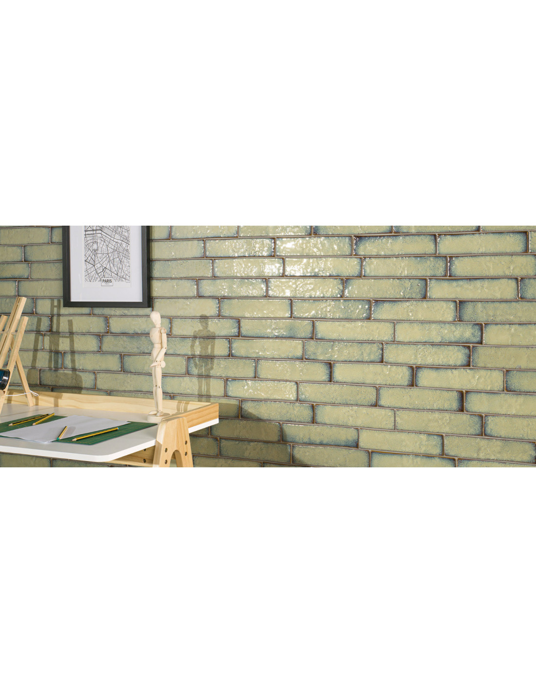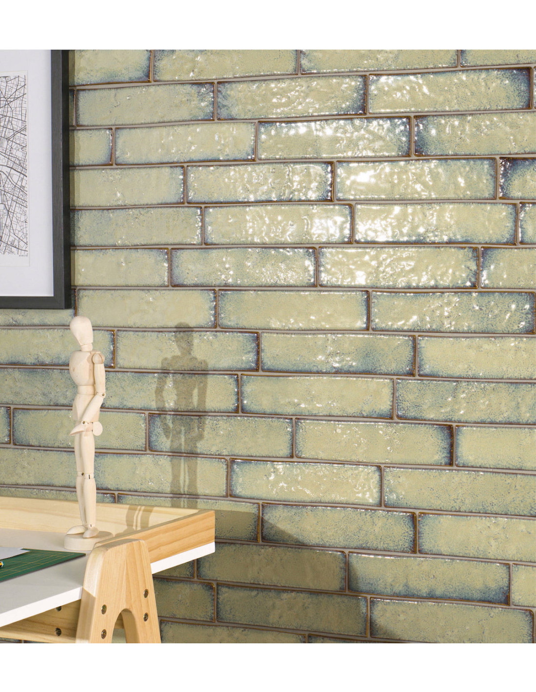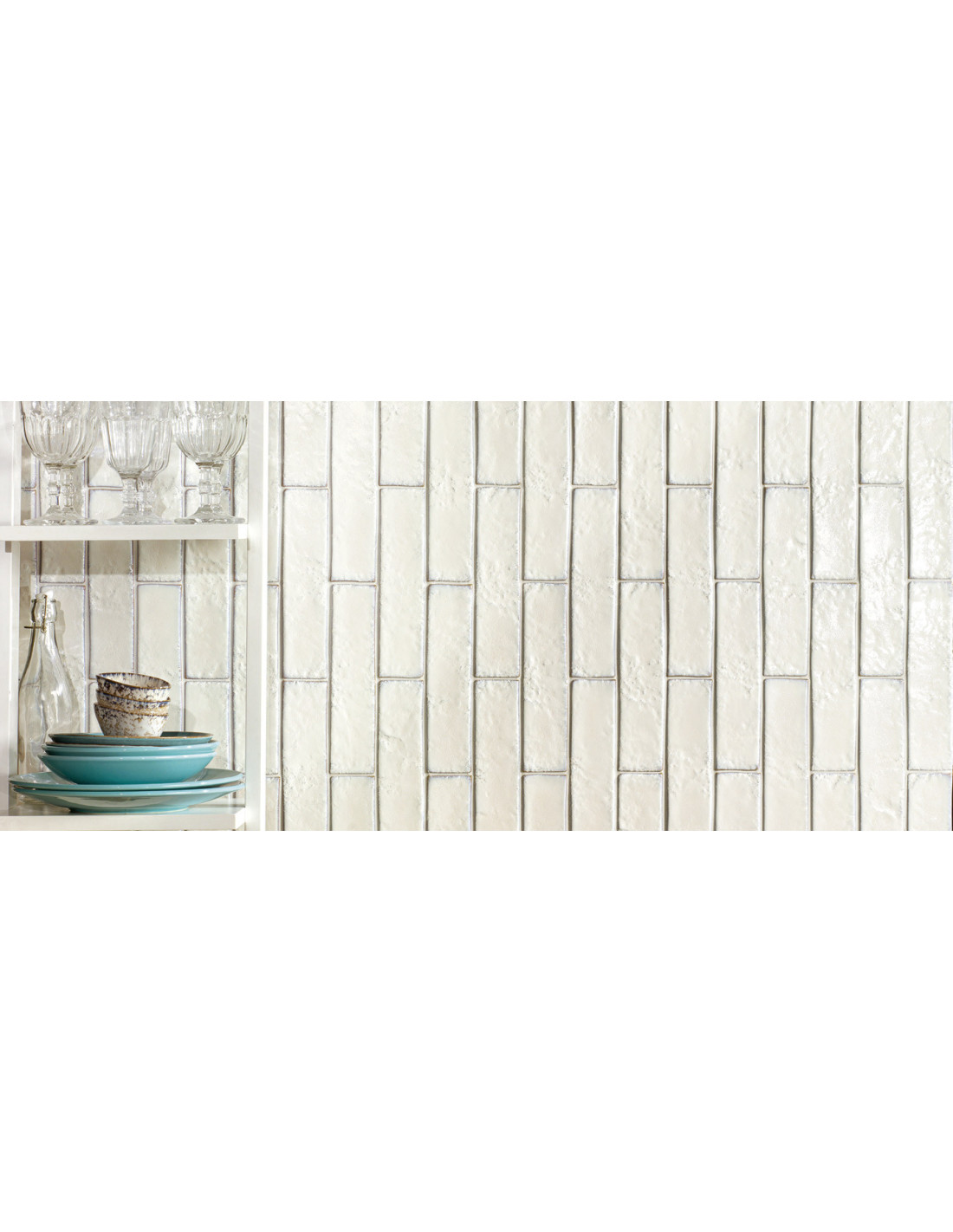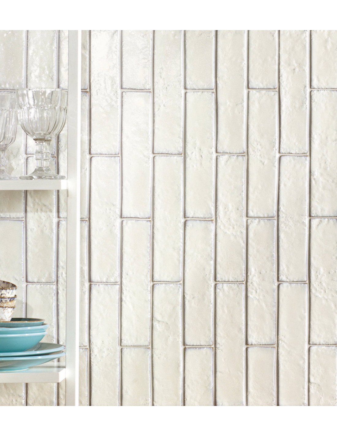 Faianta Souk cu dimensiuni 6x25 cm. Finisaj lucios, antichizat, metalizat, cu margini neregulate.